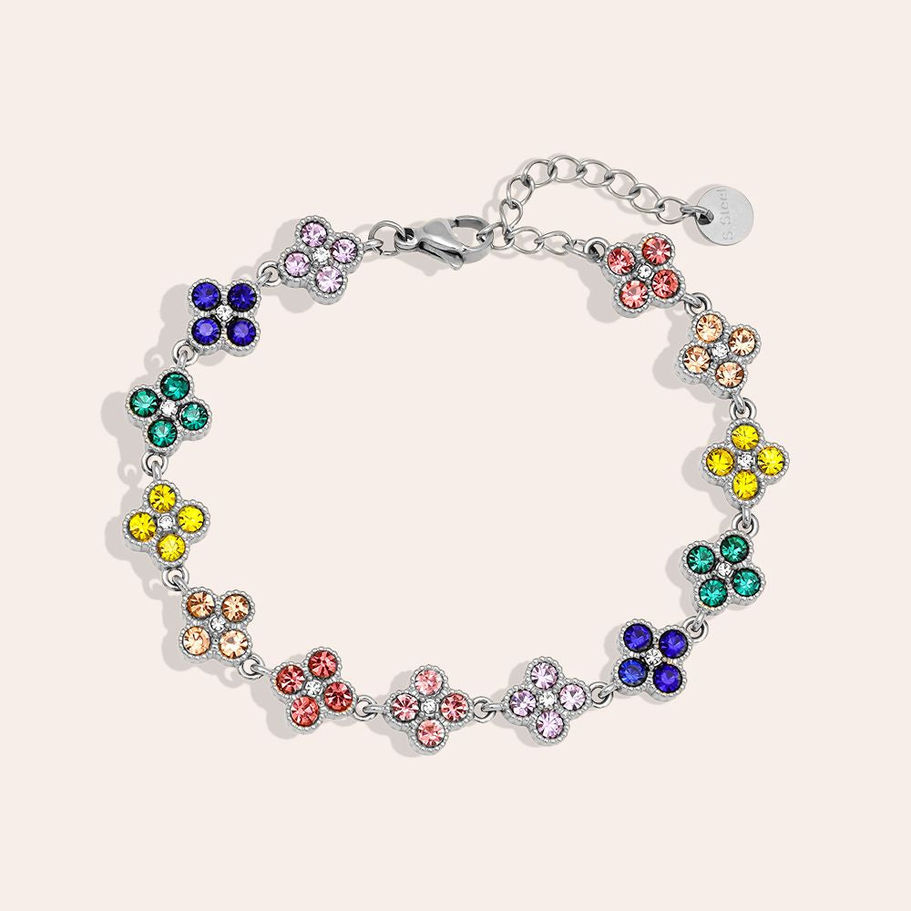 Le bracelet Blossom Rainbow apporte couleur, joie et une élégance étincelante à votre poignet. Ses délicates breloques florales, serties de pierres de zircone cubique colorées et scintillantes, attirent tous les regards – que ce soit au quotidien, pour une soirée ou pour affirmer votre style avec gaieté.