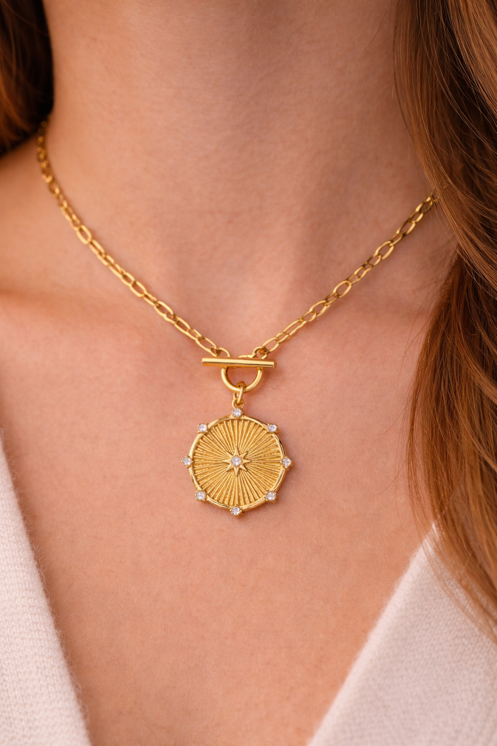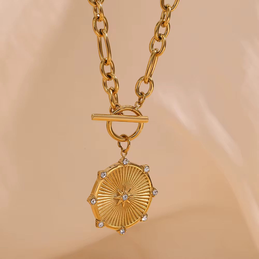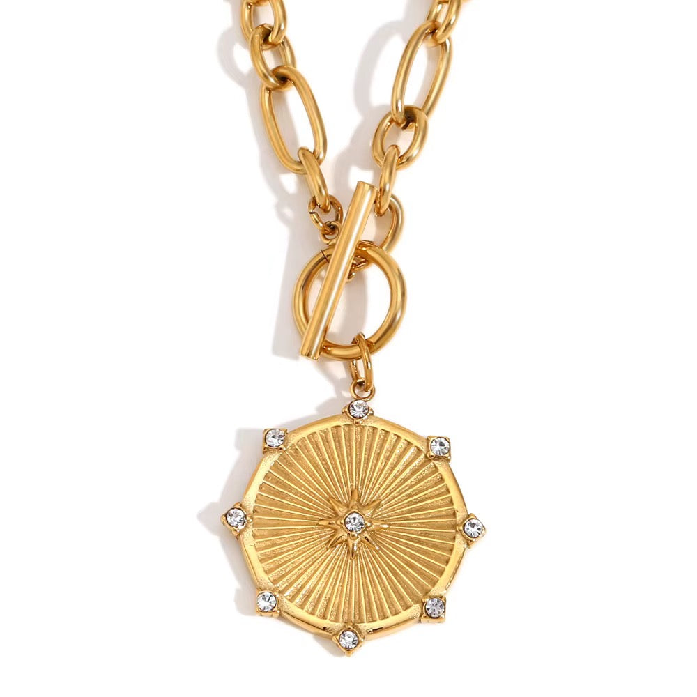 Der Solara Medallion Kette ist ein ausdrucksstarkes Schmuckstück mit strahlender Eleganz. Der runde Anhänger im Sonnen-Design symbolisiert Licht, Energie und Stärke und wird durch feine, funkelnde Steine stilvoll akzentuiert.