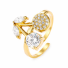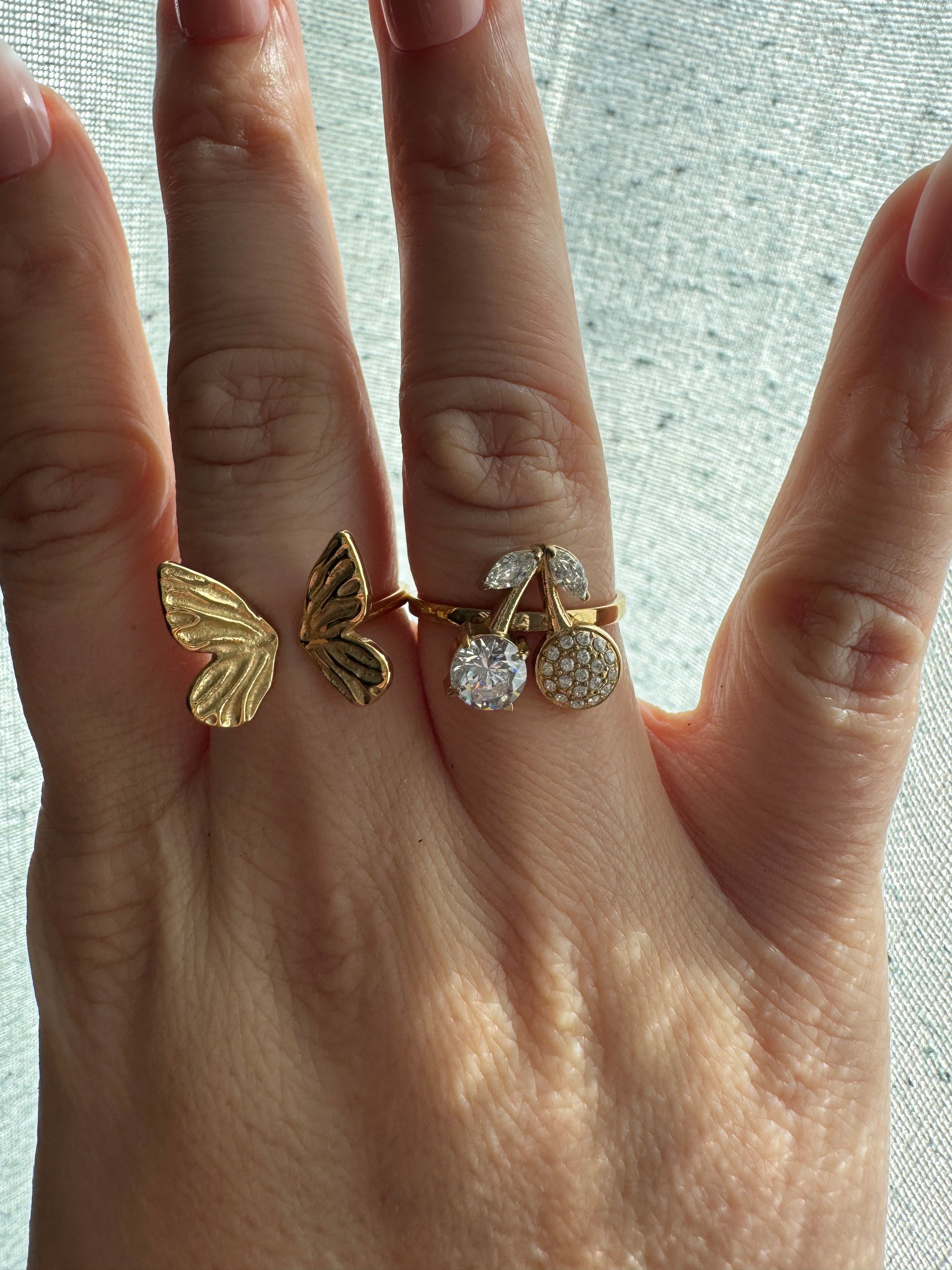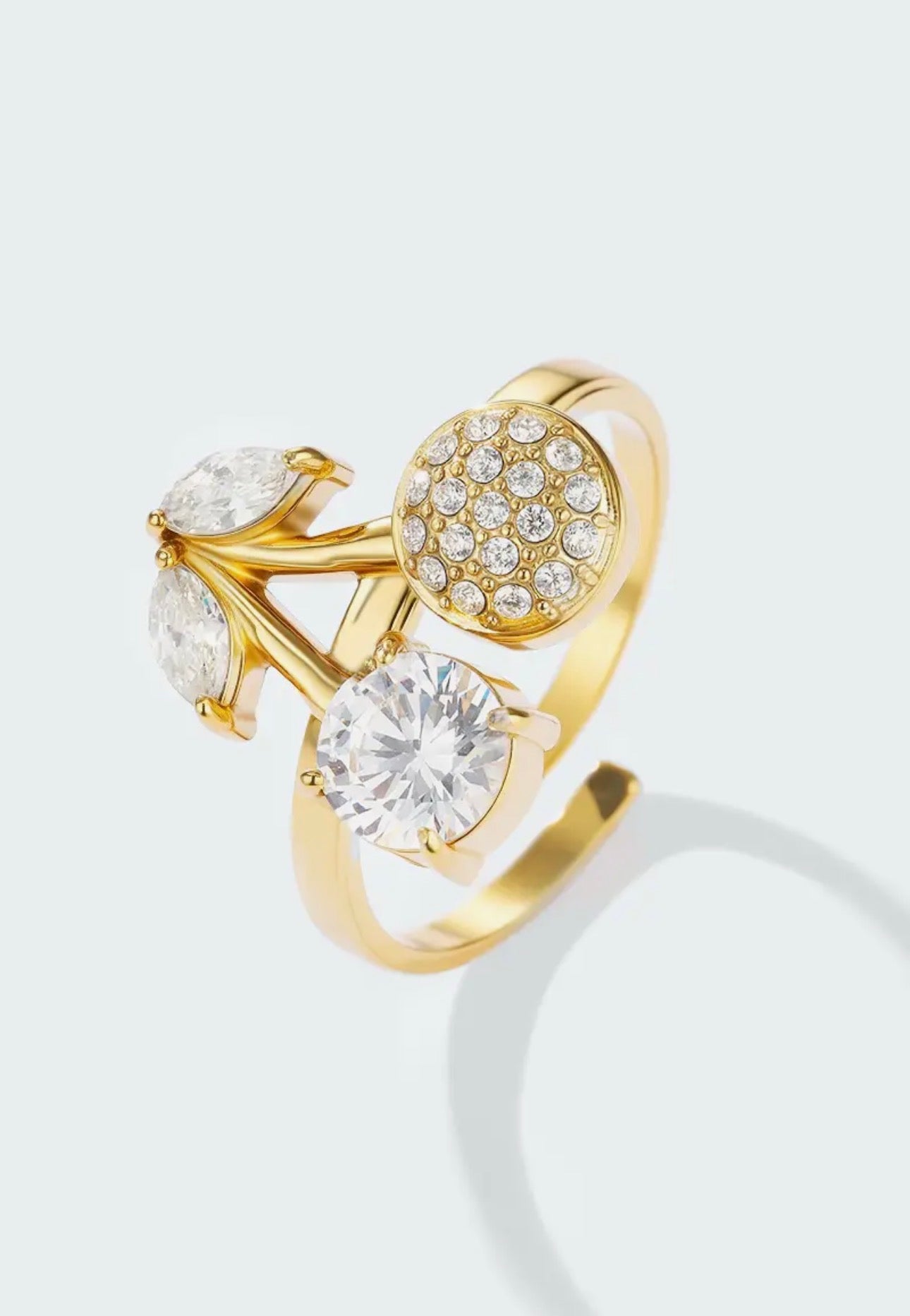 Die unterschiedlichen Steinformen erinnern an saftige Kirschen und verleihen dem Ring eine lebendige, feminine Ausstrahlung. Das goldene Finish unterstreicht den edlen Charakter, während die offene Form für einen angenehmen Sitz sorgt.