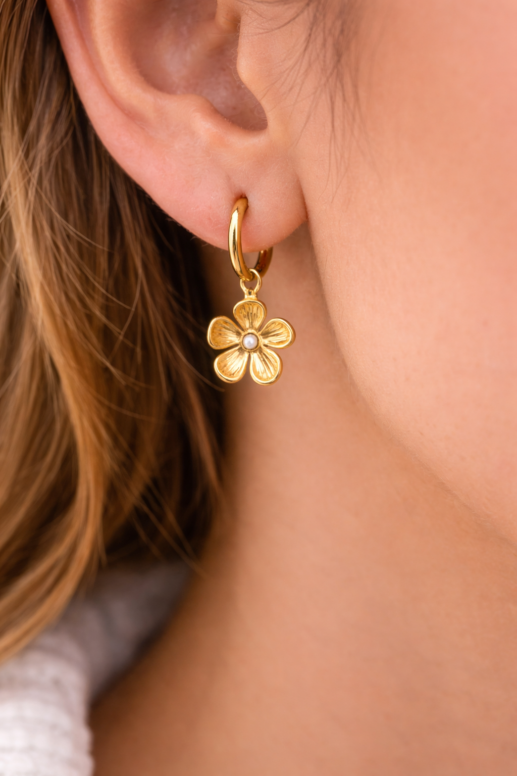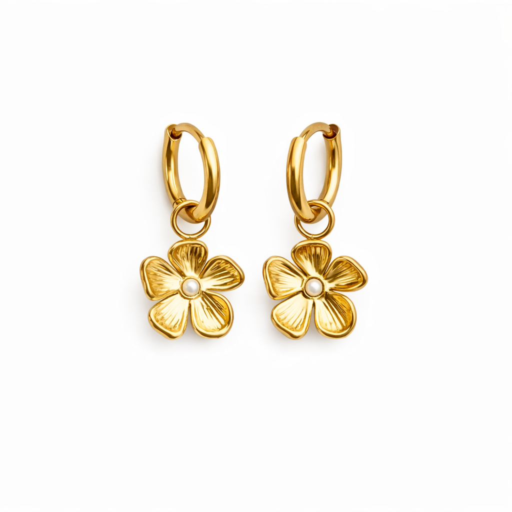 Die Floraly Ohrringe sind vergoldete Edelstahl Ohrringe für Damen, die mit ihrem filigranen Blumen-Anhänger eine feminine und elegante Ausstrahlung verleihen. Das zarte Design macht sie zum perfekten Accessoire für Alltag und besondere Anlässe.