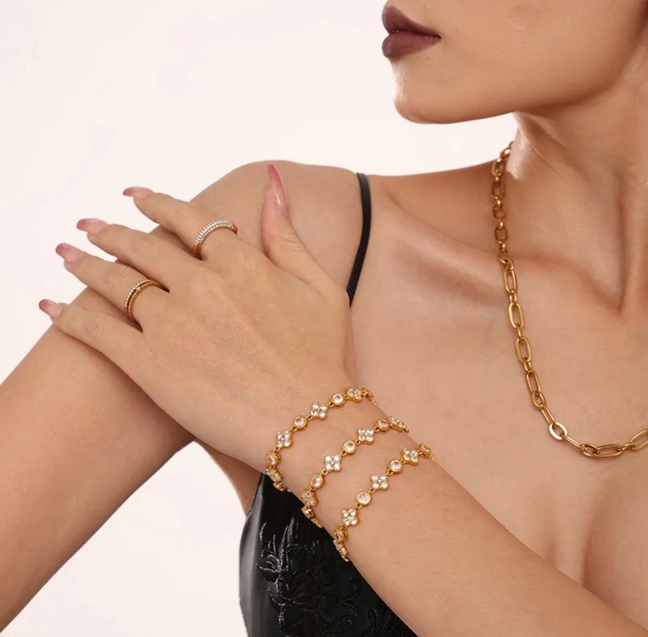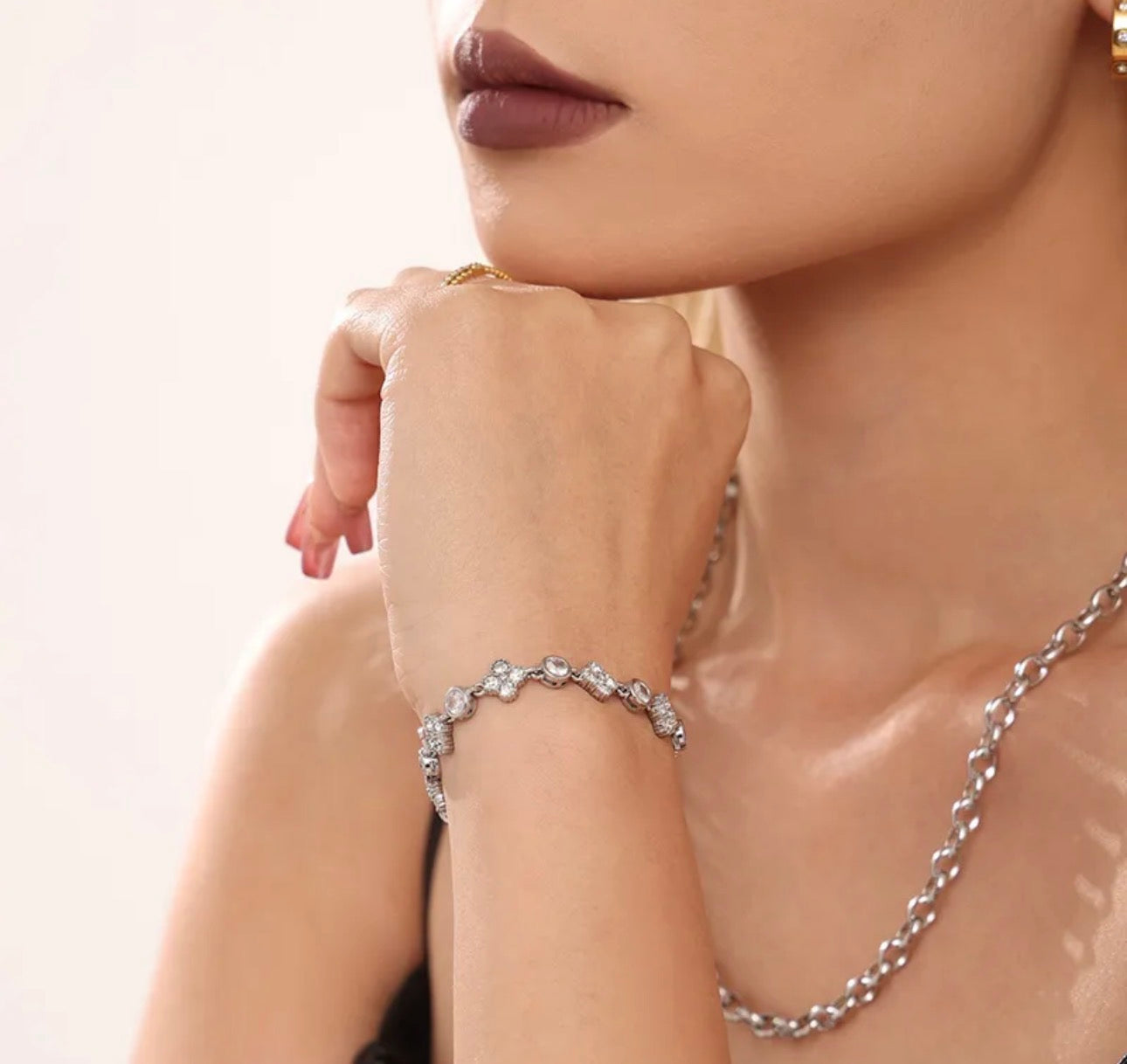 Das Kayla Shine Bracelet vereint zeitlose Eleganz mit modernem Glamour. Die harmonische Kombination aus funkelnden Zirkonia-Steinen und filigranen Blüten-Elementen verleiht dem Armband eine feminine Ausstrahlung und sorgt für einen luxuriösen Look. Ob im Alltag oder zu besonderen Anlässen – dieses elegante Zirkonia-Armband setzt stilvolle Akzente und lässt jedes Outfit strahlen.