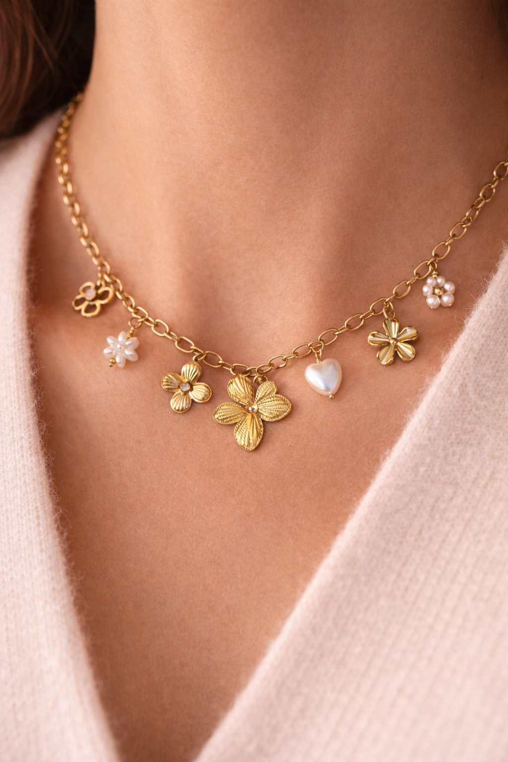 ✔ Zarte Kette mit Blumen- und Herzanhängern