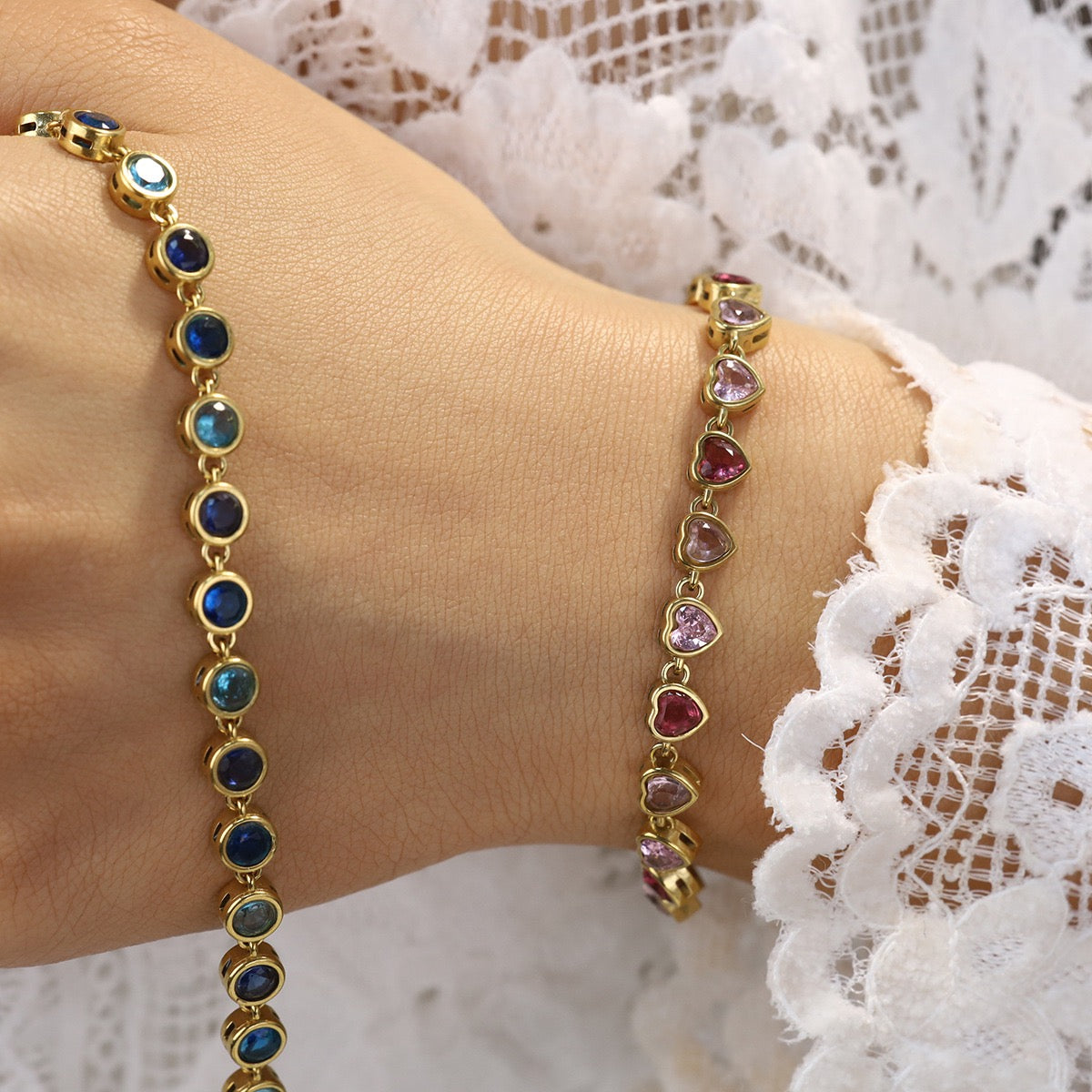 Die funkelnden Steine in Kombination mit der hochwertigen goldfarbenen Fassung sorgen für einen eleganten, luxuriösen Look. Ein Armband, das Liebe und Stil perfekt vereint – ideal für besondere Momente oder als tägliches Highlight.