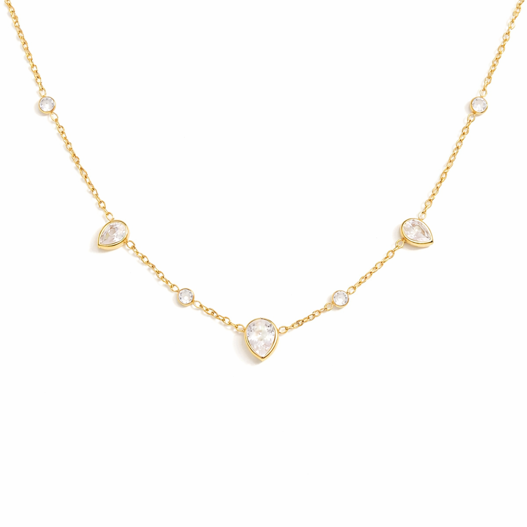 Die Sorelia Drop Necklace verkörpert zeitlose Eleganz und feminine Leichtigkeit. Fein gesetzte, tropfenförmige Zirkonia und kleine funkelnde Akzente schmücken die filigrane Goldkette und reflektieren das Licht bei jeder Bewegung. Das Design wirkt edel, modern und dennoch zart – perfekt für einen stilvollen Alltagslook oder besondere Anlässe.